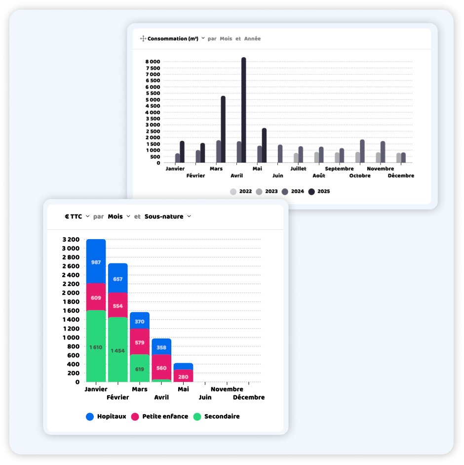 Ainsi, vous pouvez facilement identifier les périodes de consommation élevée, comparer les usages entre différents espaces ou locataires, et détecter des anomalies telles que des fuites.